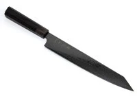 -Wert, Messgröße für die Härte des Stahls, liegt bei 61. VG-10 ist ein Edelstahl und enthält im Unterschied zu den Kohlenstoffstählen Aogami oder Shirogami ca. 15% Chrom. Die Ummantelung besteht aus 16 Lagen härterem und 18 Lagen etwas weicherem Nickel Damast, so dass Härte, Schärfe und die sinnvolle Elastizität in einem hervorragenden Verhältnis zueinanderstehen. Finish: Optisch wird die Klinge einerseits durch die Damast Lagen, andererseits – im oberen Bereich – durch das Hammering dominiert. Bevor die Klinge gehämmert wird, bearbeitet Yoshimi die Klingen-Oberfläche mit einem besonders feinen Schliff. In Test hat sich herausgestellt, dass der eckige, besondere Stil des Hammerings den Antihaft-Effekt für Schnittgut sehr gut unterstützt. Griff: Der Griff dieser Messer ist aus hochwertigem, schwarzem