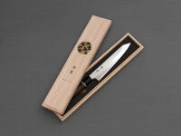 hat eine Klingenlänge von 150 mm. Ein sehr praktisches und handliches Messer, mit dem viele Arbeiten in der Küche erledigt werden können. Der schöne, sehr haltbare und pflegeleichte Griff besteht aus einem Holzlaminat, ist achteckig ausgeführt und liegt hervorragend in der Hand. Die 62 Lagen Damaststahl schenken dem Zuiun zur nötigen Flexibilität auch eine unvergleichliche Optik. Jedes Zuiun Messer wird in der originalen Geschenkverpackung aus Holz geliefert. Freuen Sie sich auf ein exklusives japanisches Kochmesser aus Seki, der Messerhauptstadt in Japan.