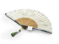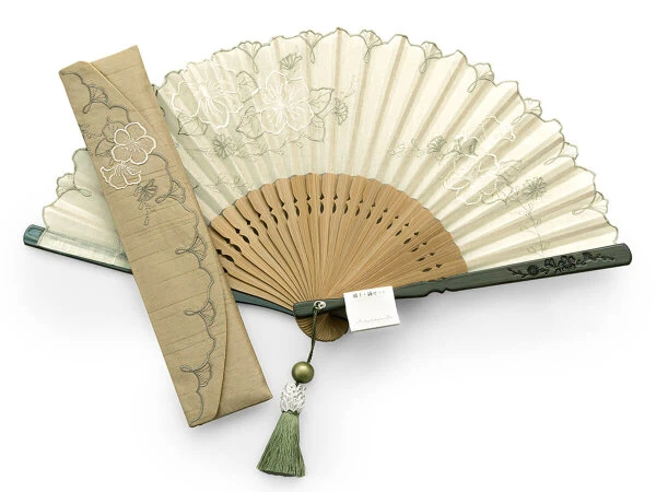 Für die Faltfächer der Serie Eien ist die Blume Utfugi das passende Motiv. Eien bedeutet so viel wie Ewigkeit und die zarten Blumen wurden so auf die japanische Baumwolle gestickt, dass sie auf ewig mit ihr verbunden sind. Die handgemalten Bilder waren mit den weichen Linien eine herausfordernde Vorlage. Die Textur gleicht einer antiken Spitze. Der klassische Fächer hat eine Steglänge von ca. 21 cm und ist offen ca. 38 cm breit. Ein Bild von einem Handfächer.