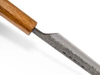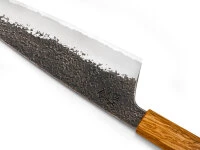 Geschmiedet wurden diese Messer von Itsuo Doi, einem der „Dento-Kogei-shi“-Preisträgern bei Aoki. Warikomi ist eine traditionelle Technik, bei der ein Eisenblock erhitzt und gespalten wird. In den Spalt wird der Schneidkern aus Kohlenstoffstahl – hier Aogami 2 – eingefügt und feuerverschweißt. Aus dem entstandenen Rohbarren schmiedet Itsuo Doi dann unter Hitze die jeweilige Klinge. Alle Messer der Serie Homura Guren haben ein Black Finish mit von Hand gehämmerter Oberfläche. Die hochwertigen Griffe sind aus geflammter Eiche, die mit
