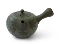 Japanische Seitengriff-Teekanne von Seiho Tsuzuki, Tokoname mit Ahornblatt-Design. Die Teekannen von Seiho Tsuzuki sind unter versierten Grüntee-Trinkern sehr beliebt. Seine Vita als Keramikkünstler ist beeindruckend. Für das Design verwendet er echte Ahornblätter, um die natürliche Schönheit des Motivs möglichst detailgerecht herauszuarbeiten. Die Ahornblätter legt er auf eine dünne Schicht Schlicker, zieht sie dann ab um die Details von Hand fertigzustellen. Wenn Sie genau hinschauen, können Sie tatsächlich den Abdruck der Adern des ursprünglichen Blattes sehen. Die Kuro Momiji Teekanne ist ein charmantes Keramikkunstwerk mit raffinierten Details. Integriert ist ein Keramik Netzfilter-Sieb. Die Teekanne wird in einer schönen, vom Meister signierten Holzbox geliefert.