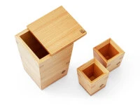 Set aus einer Sakekaraffe und zwei Sakebeschern. Ein guter Sake wird, genossen aus dem Sakegeschirr der Marke Omoeraku, zu etwas Besonderem. Der feine Zedernduft unterstützt wunderbar die Aromen des Sake. Nikko heißt das ausgewählte Zedern-Holz der Karaffe Tokkuri. Es ist ein eingetragenes Weltkulturerbe. Zur Pflege des Baumbestandes wird regelmäßig Holz geschlagen, lange gelagert und zum Beispiel zu hochwertigen Gefäßen wie Tokkuri und Masu von Hand verarbeitet. Der Genuss von Sake aus hölzernen Karaffen und Bechern hat in Japan eine lange Tradition. Aber Perfektionierung liegt den Holzhandwerkern von Kanuma natürlich im Blut. So ist es nur folgerichtig, dass das Sakegeschirr mit dem Tochigi Excellent Design Award ausgezeichnet wurde.